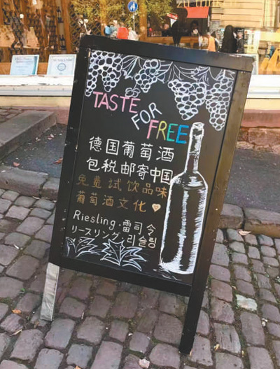 德國法蘭克福,當(dāng)?shù)仄咸丫粕掏瞥隽酥形膹V告牌。記者 李強(qiáng)攝