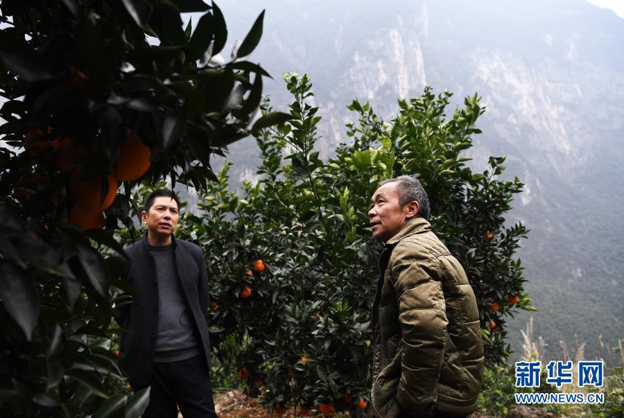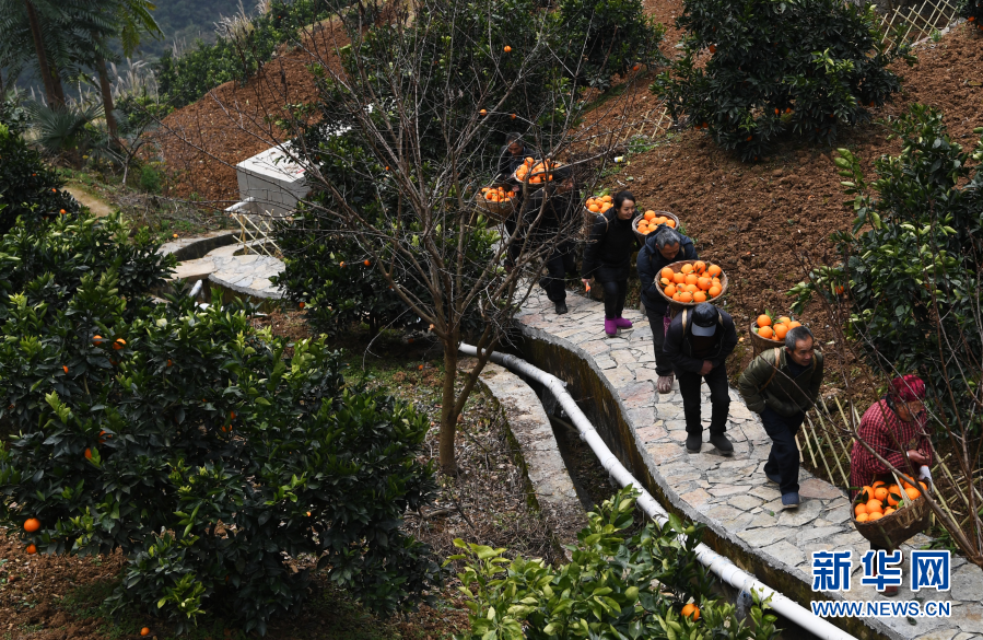 1月7日,毛相林(右二)和下莊村村民在背運(yùn)剛采摘的柑橘。新華社記者王全超 攝
