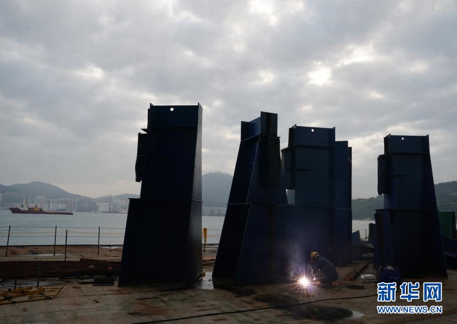 工人為即將安裝的香港將軍澳大橋主橋進(jìn)行最后準(zhǔn)備工作(2月25日攝)。新華社記者 李鋼攝