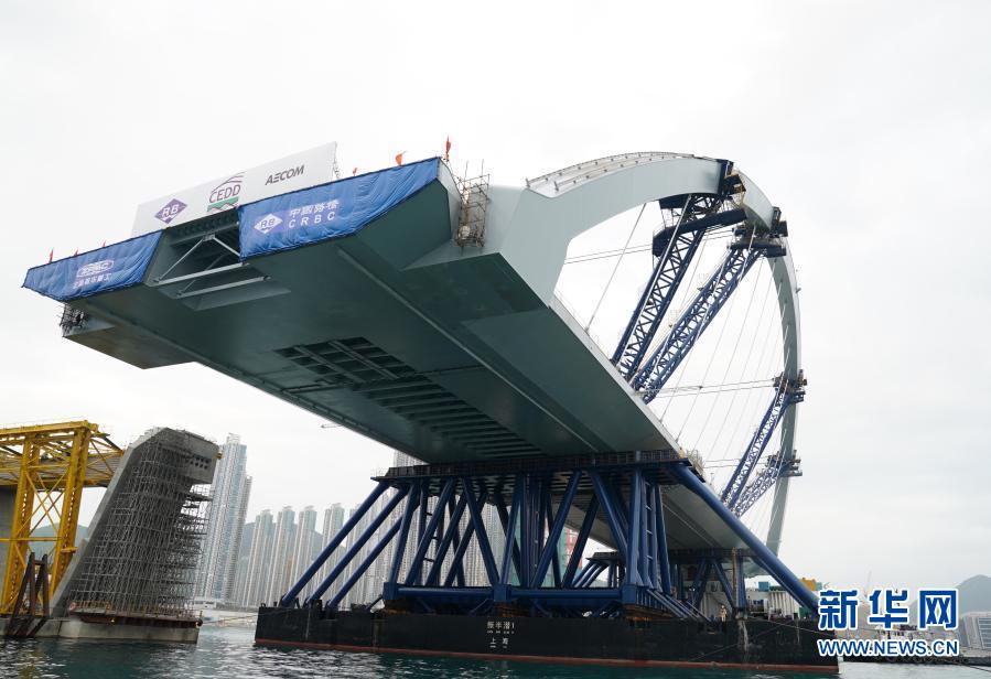 2月26日,將軍澳跨灣大橋主橋順利完成浮托安裝,浮托安裝總重達(dá)12000噸,總長214米,創(chuàng)造國內(nèi)單體拱橋整體安裝的新紀(jì)錄。