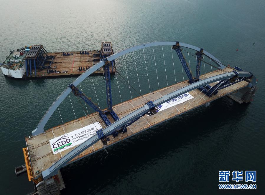 2月26日,從早晨7時(shí)開始,歷時(shí)5個(gè)小時(shí),首次利用海潮漲落的“浮托法”,70多位現(xiàn)場施工人員經(jīng)過緊張調(diào)試,將內(nèi)地預(yù)制好的雙拱鋼橋精準(zhǔn)對接并安裝在橋墩上。
