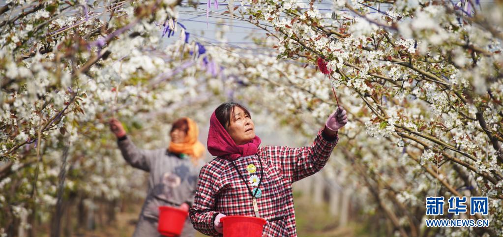 4月6日,山東濱州鄒平市長(zhǎng)山鎮(zhèn)八方農(nóng)場(chǎng)的果農(nóng)在給梨花授粉。