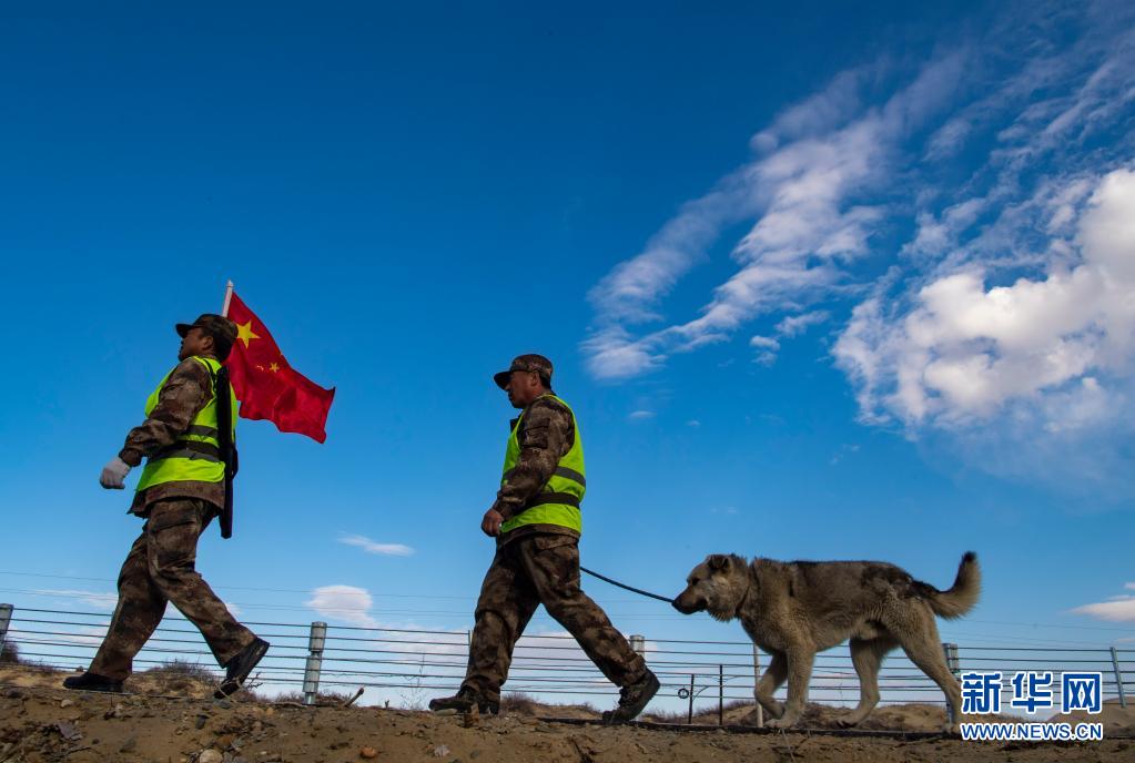 新疆生產(chǎn)建設(shè)兵團(tuán)第10師185團(tuán)職工馬軍武(右)在巡邏途中(4月9日攝)。