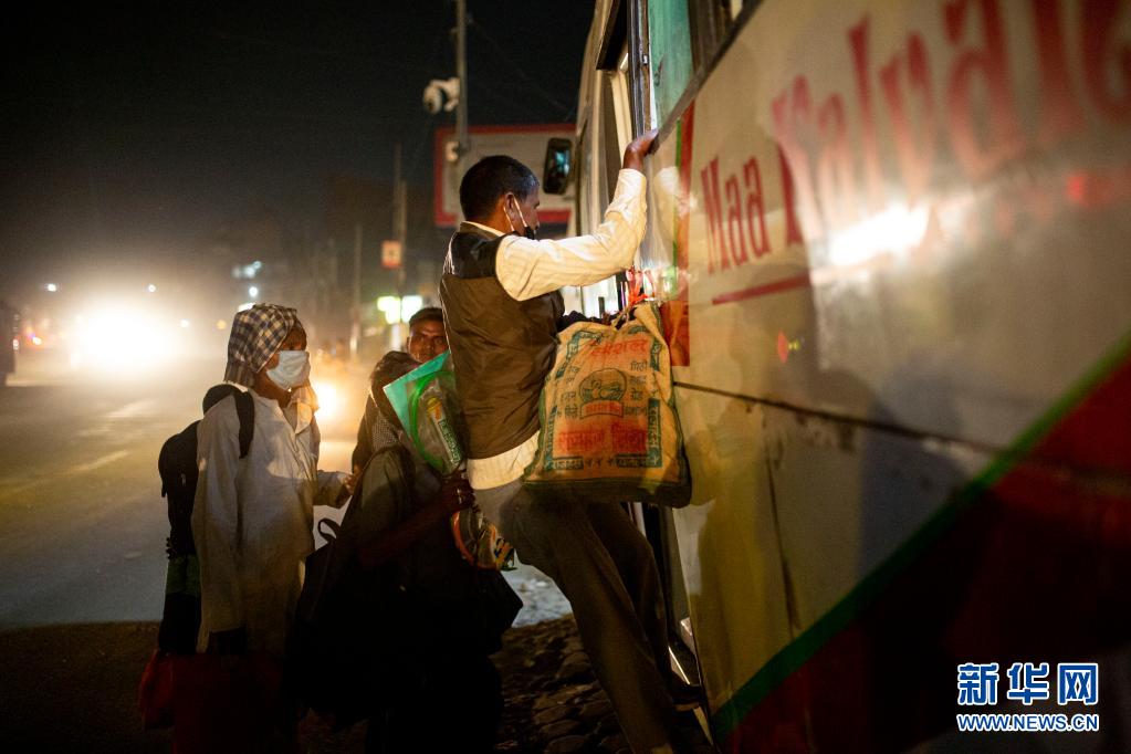 4月29日凌晨,人們在尼泊爾首都加德滿都登上長途客車,準(zhǔn)備在封禁措施實(shí)施前離開加德滿都返回家鄉(xiāng)。
