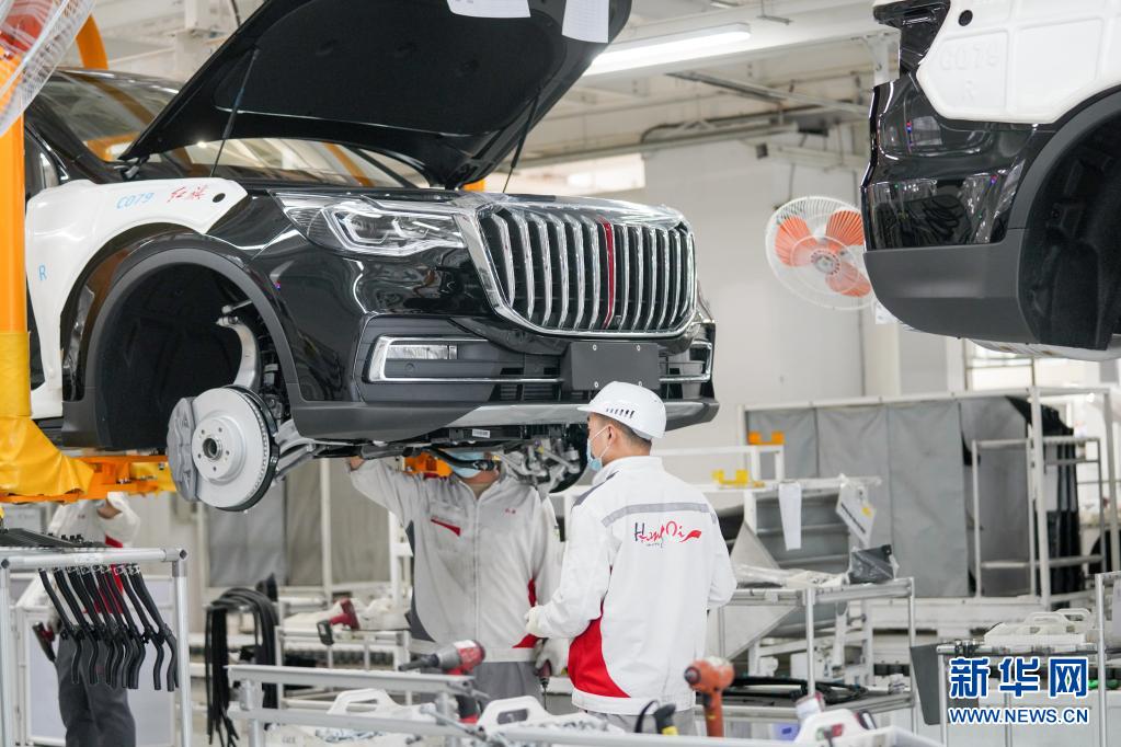 在位于吉林長(zhǎng)春的一汽紅旗工廠總裝車間,工人在裝配車輛(4月28日攝)。