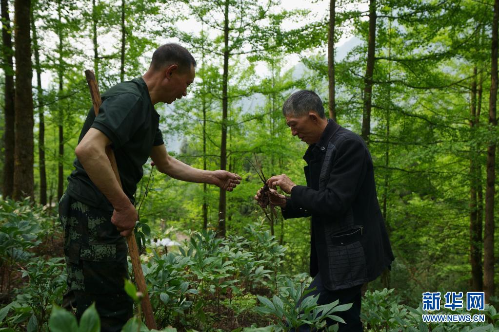 5月4日,村里的林下種植大戶鄧建述(右)在幫林興聰分析林下種植的藥材生病的原因。 新華社記者 江宏景 攝