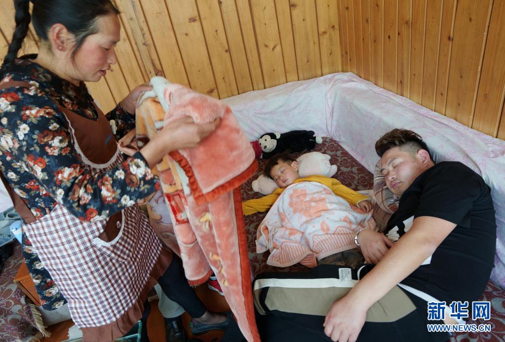 5月4日,李蕓香(左)給午睡的兒子邱超(右)、孫子邱早睿蓋毛毯。 新華社記者 江宏景 攝