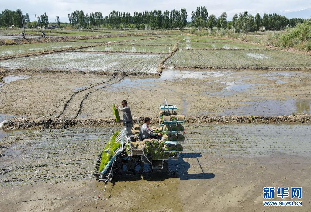 進(jìn)入5月,新疆溫宿縣的11萬余畝水稻進(jìn)入插秧期。稻田間,插秧機往來穿梭,一片繁忙景象。