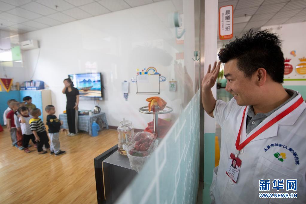 在太原市社會(兒童)福利院內(nèi)的特教學校,黨龍祥看著正在為六一準備節(jié)目的孩子們(5月26日攝)。新華社記者 楊晨光 攝