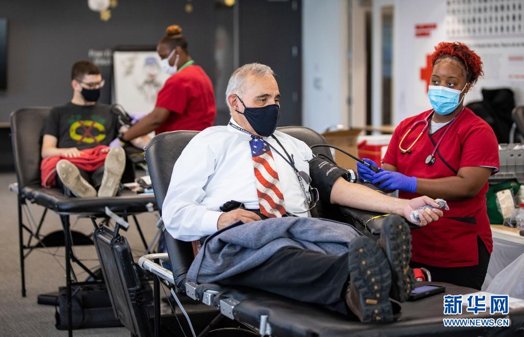 6月14日,在美國芝加哥,兩名獻(xiàn)血志愿者在大芝加哥地區(qū)紅十字會一獻(xiàn)血站內(nèi)測量血壓。新華社發(fā)(喬爾·萊納攝)