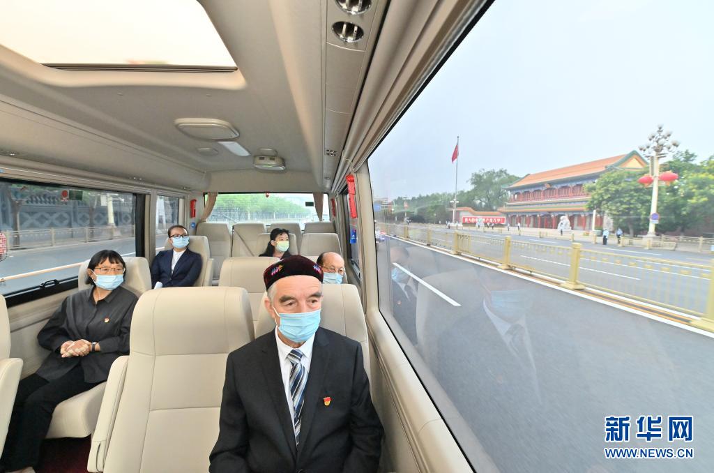 這是買買提江·吾買爾(前)、張桂梅(左一)、吳天一(右一)乘車前往人民大會堂。