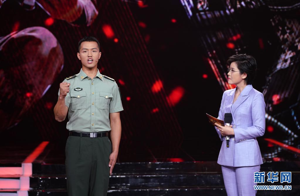 在“時(shí)代楷模”發(fā)布儀式上,陸軍第八十三集團(tuán)軍某旅“紅一連”副班長(zhǎng)徐謙(左)講述黨員骨干“跟我來(lái)”的故事(7月23日攝)。新華社記者 張永進(jìn) 攝