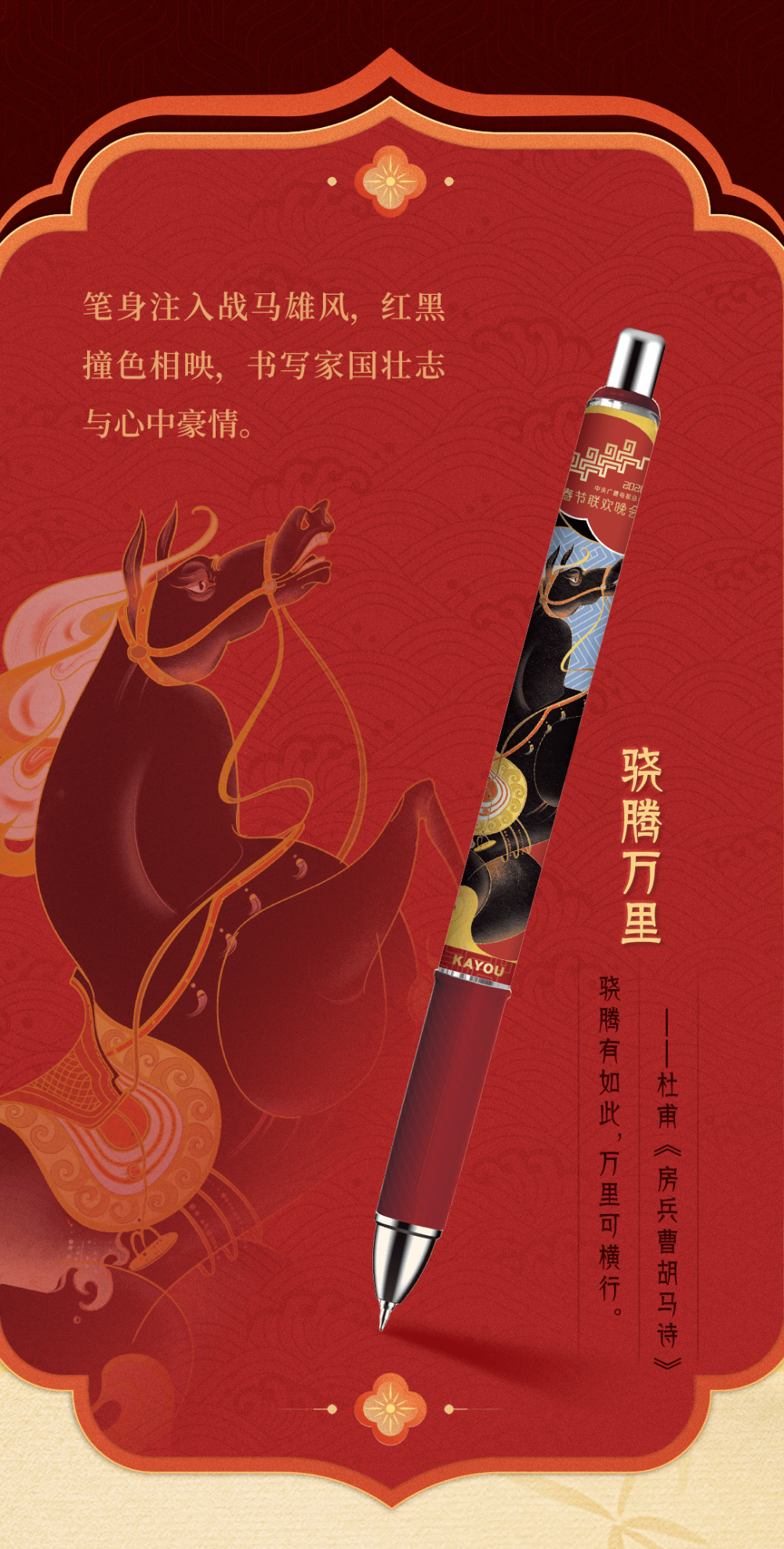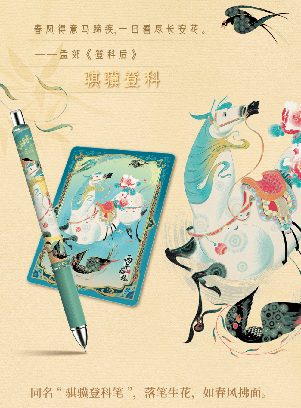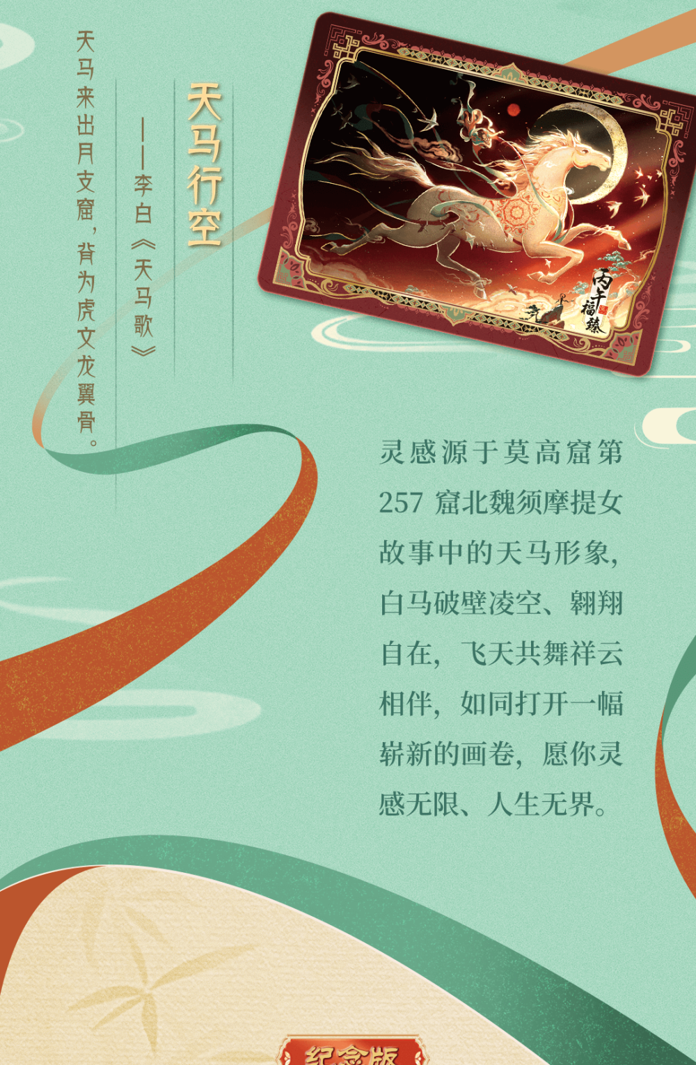 走入卡牌的微观世界,就会发现“文化+科技”的融合是它成为文创新载体的重要原因。以“骐骥驰骋典藏卡”为例,这套总台春晚携手卡游创作推出的新春礼盒,内含8张卡牌及2支笔。它的设计团队从唐代昭陵六骏的雄姿中寻找线条,从敦煌壁画的飞天纹样里提取元素,用14组数控翻转模块的舞美技术作为灵感,让千年的“骐骥”在纸面上重新奔跑。