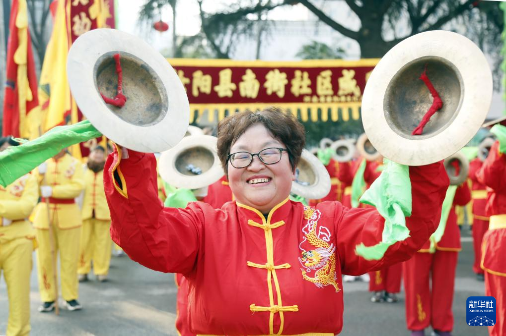 2月17日,河南省洛阳市汝阳县城关镇南街社区威风锣鼓队队员表演打镲。