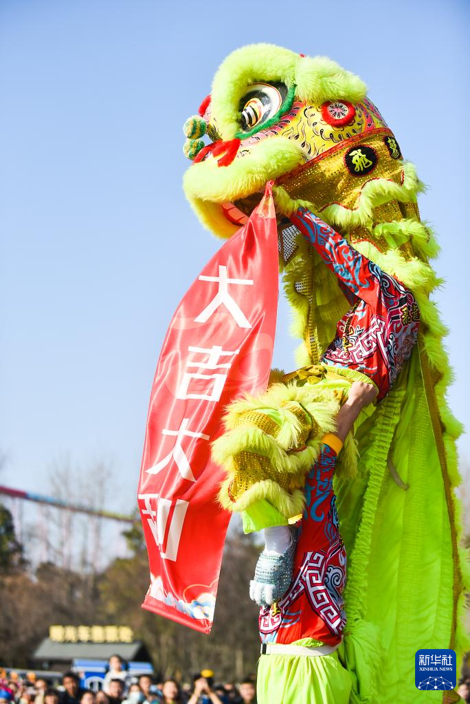 2月17日在河南省洛阳市隋唐城遗址植物园新春庙会上拍摄的舞狮表演。