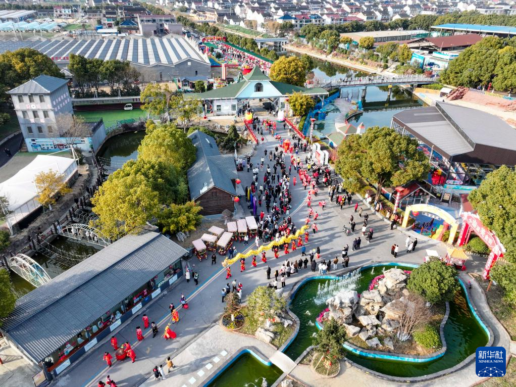 2月17日,在江苏省泰兴市黄桥镇祁巷村,民俗表演队开展民俗巡游表演(无人机照片)。