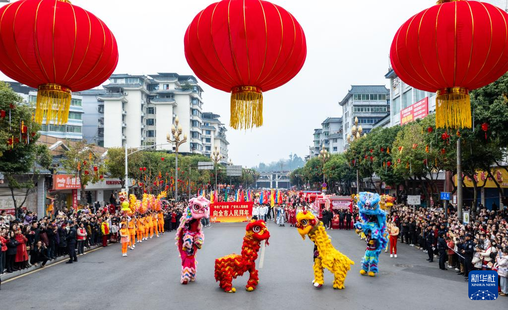 2月17日,四川省广安市广安区举行街头民俗巡游展演,市民和游客在观赏舞狮表演(无人机照片)。