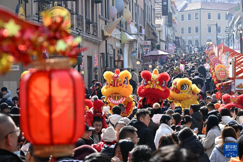 2月17日,游客在山东省青岛市市北区大鲍岛文化休闲街区观看舞狮表演。
