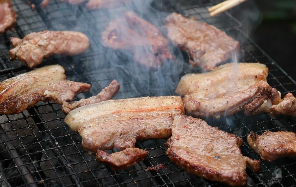杀猪饭的菜式丰富多样,其中火烧肉是当之无愧的灵魂所在。新鲜猪肉被切成厚片,简单调味后置于炭火上炙烤。油脂滋滋作响,肉色逐渐变得金黄,香气四溢。之后,猪肝炒饵块、炖血旺、腌菜炒肉、橄榄果猪肺汤等地道农家菜相继上桌。