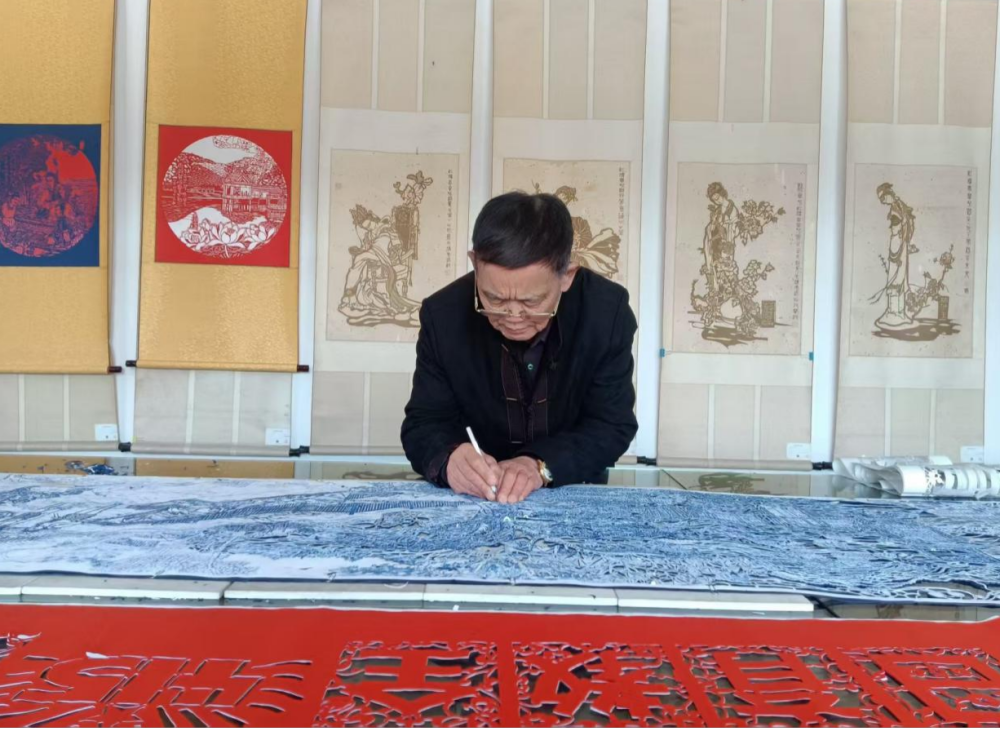 非遗剪纸“守”艺人朱朴光正在进行剪纸创作