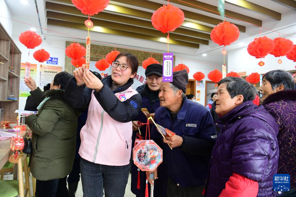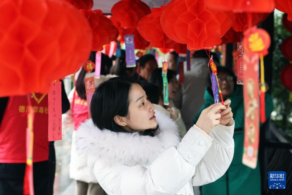 2月22日,在浙江省湖州市德清县乾元镇法治长廊,居民参与法治知识为主题的猜灯谜活动。
