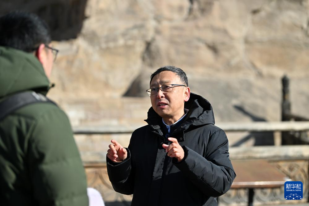 杭侃(右)在云冈石窟调研走访,了解游客的需求(2月25日摄)。