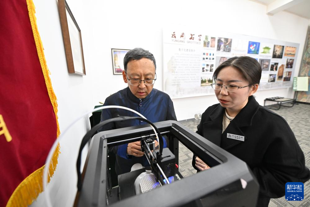 在云冈研究院数字化保护中心,杭侃(左)和同事交流文创产品设计方案(2月25日摄)。