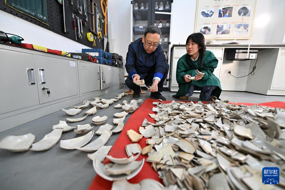 在云冈研究院可移动文物修复室,杭侃(左)和同事交流瓷器修复方案(2月25日摄)。