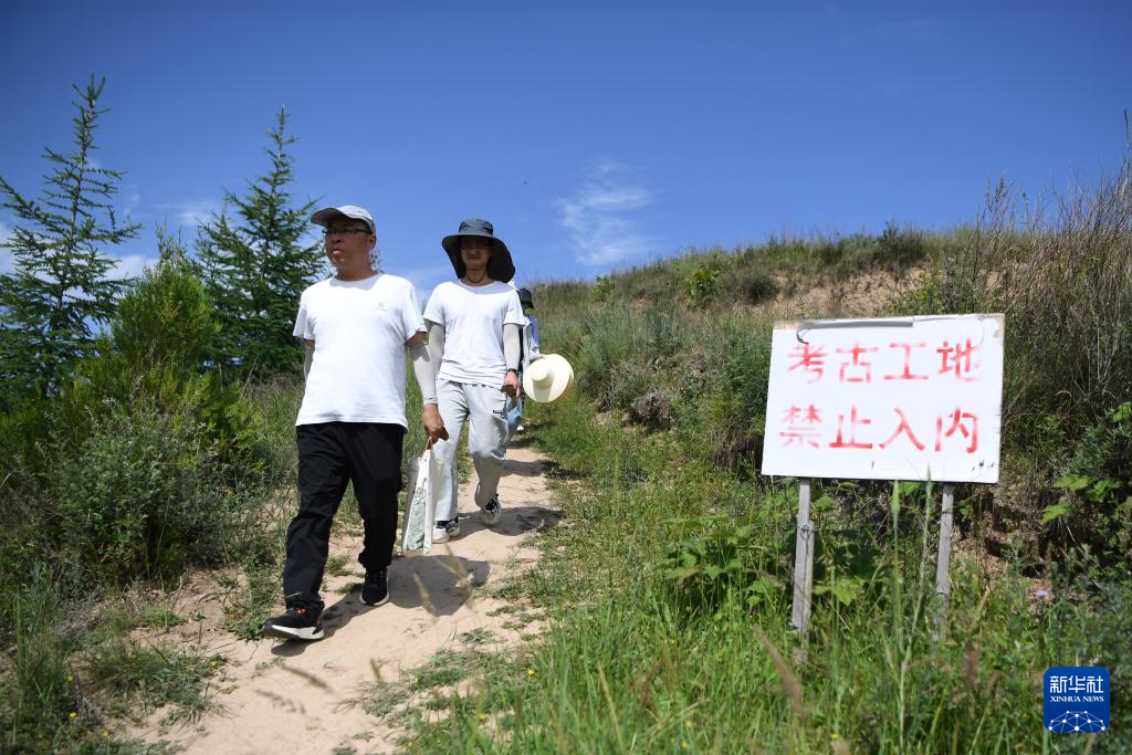 四角坪遗址考古领队、甘肃省文物考古研究所副研究馆员侯红伟(前)带领考古专业研究生在甘肃省陇南市礼县四角坪遗址考古发掘现场工作(2022年6月10日摄)。