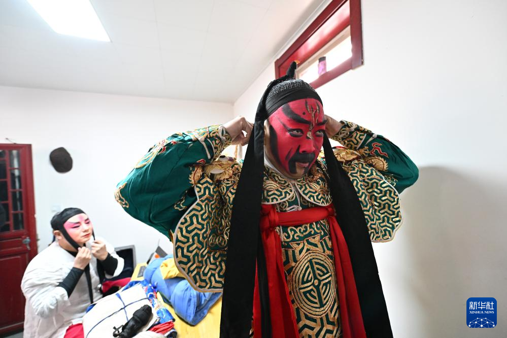 在太原市迎泽区庙前街太原大关帝庙,武凌云(右)和扮演关平的王胜军整理头饰准备上场演出(2月23日摄)。
