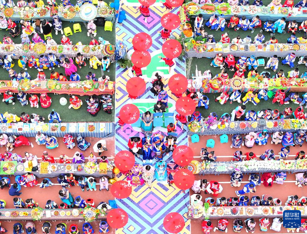 4月10日,老师和孩子们在广西南宁市逸夫小学庆祝“三月三”(无人机照片)。