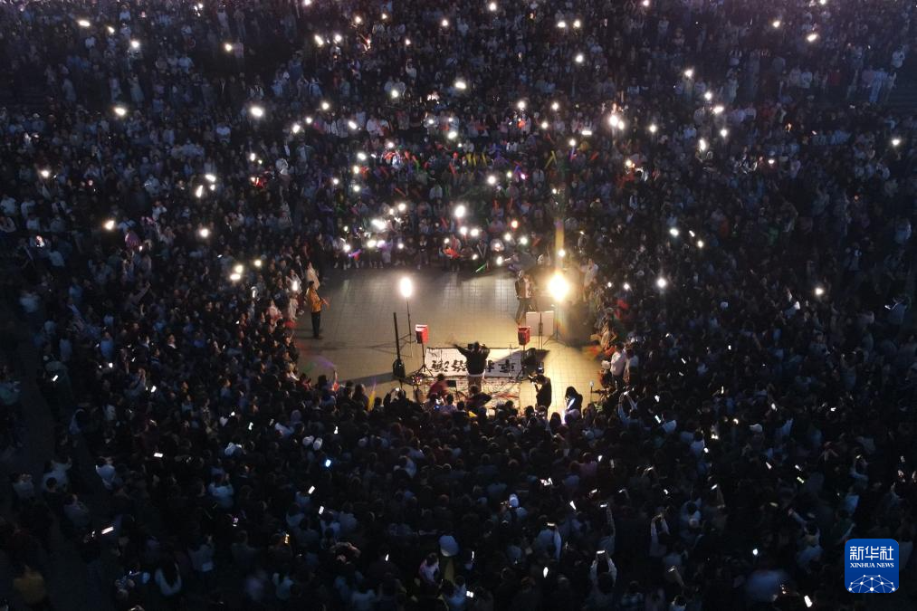 4月23日,在兰州市城关区的黄河兰州段近水平台,市民及游客参与“兰州黄河大合唱”活动(无人机照片)。
