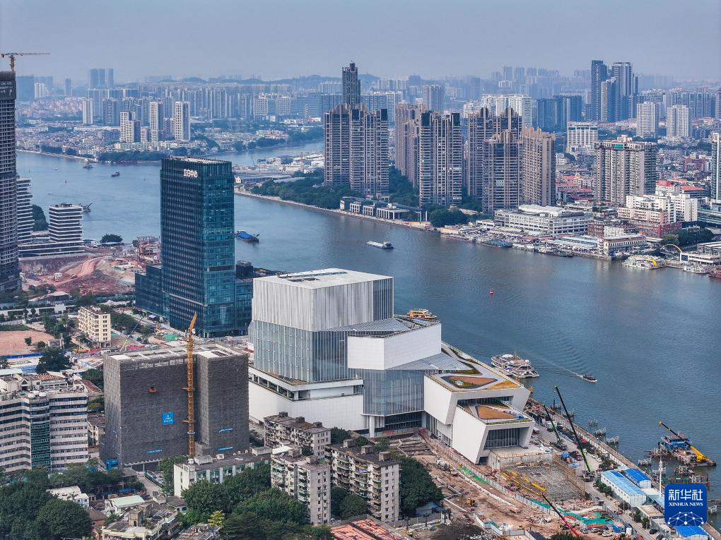 2024年4月27日拍摄的即将正式启用的白鹅潭大湾区艺术中心(右)。