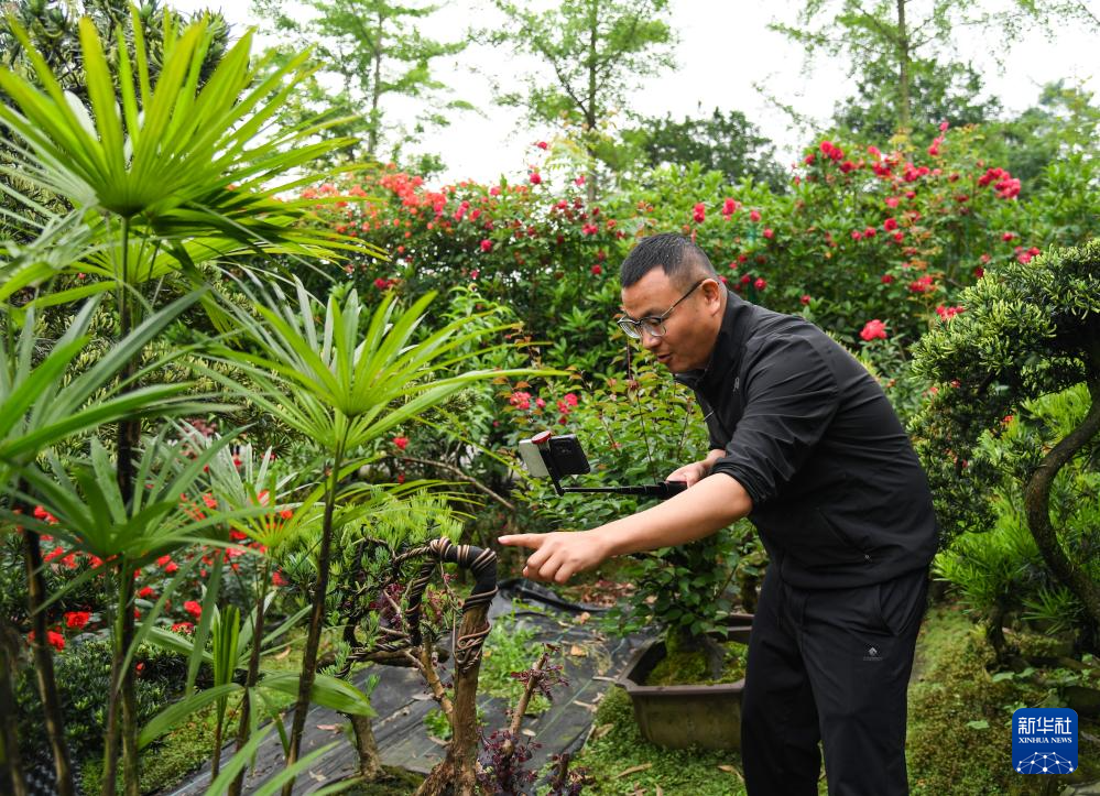 5月2日,在位于四川省成都市温江区的川派盆景游学体验基地,陈宏宇通过手机直播向网友介绍盆景相关知识。