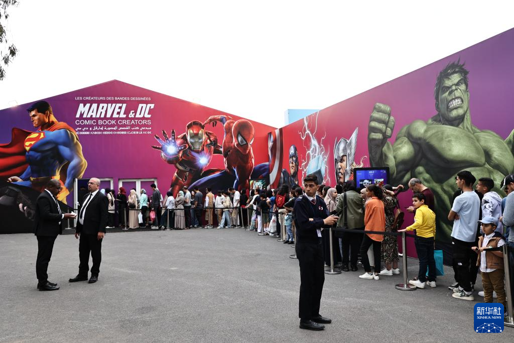 5月11日,人们在摩洛哥拉巴特国际书展上排队等待观看漫威主题的展览。