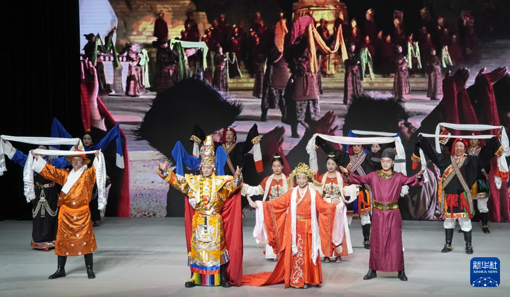 来自青海玉树藏族自治州岭格珠民间歌舞团的农牧民演员在表演民族团结进步短剧《唐蕃古道》(5月13日摄)。