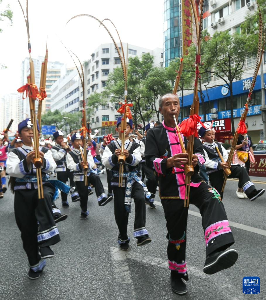 5月15日,少数民族群众在贵州省黔南布依族苗族自治州都匀市表演芦笙舞。