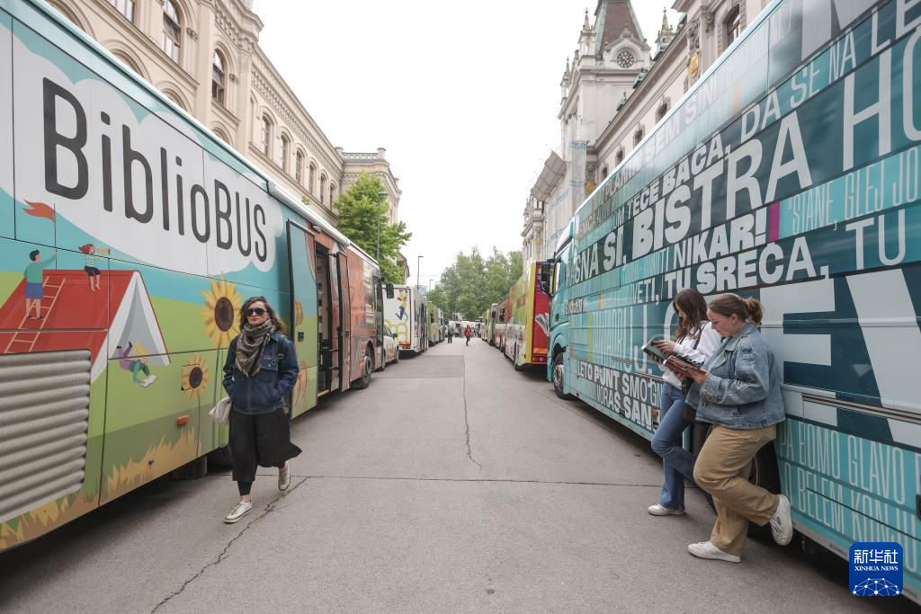 5月16日,在斯洛文尼亚卢布尔雅那,参观者在移动图书馆大巴车外读书。