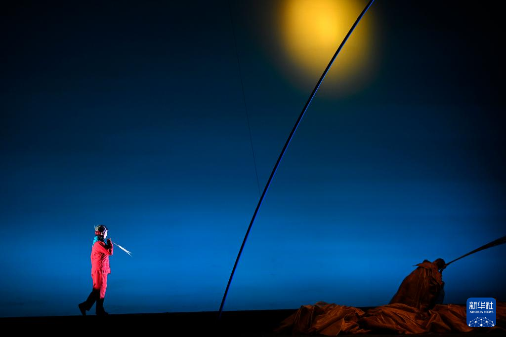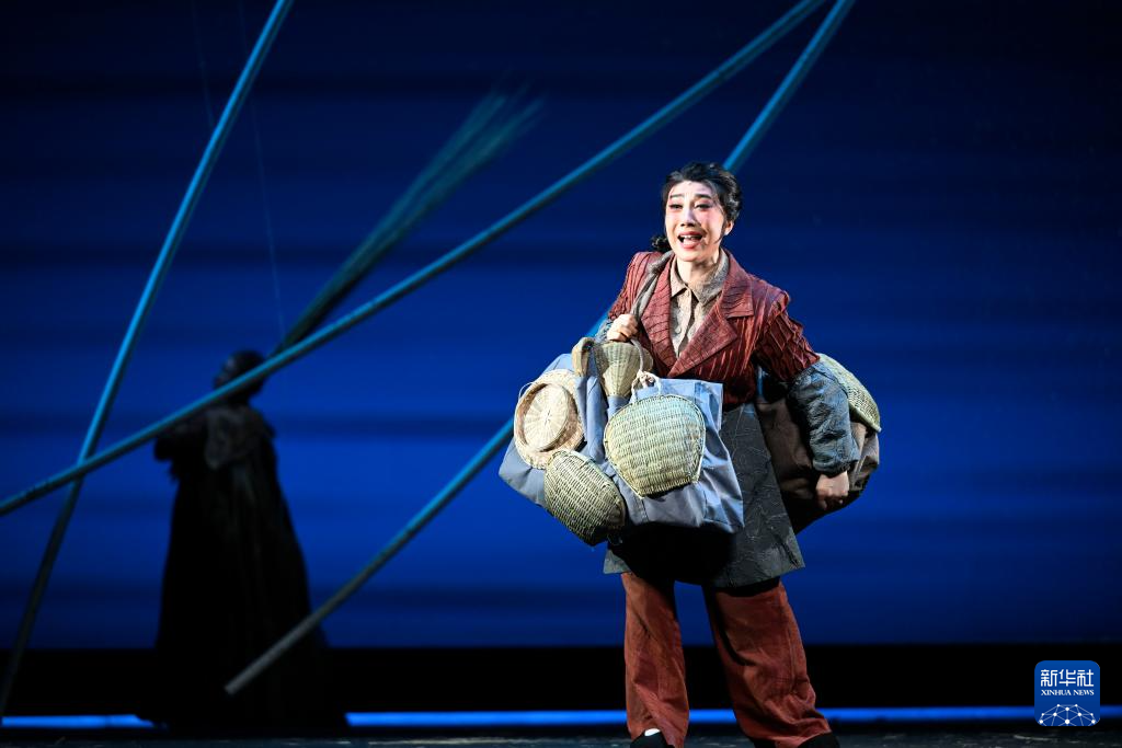 5月15日晚,在宁夏人民剧院,饰演李水河的侯艳(前)在《攒劲女人》中表演。