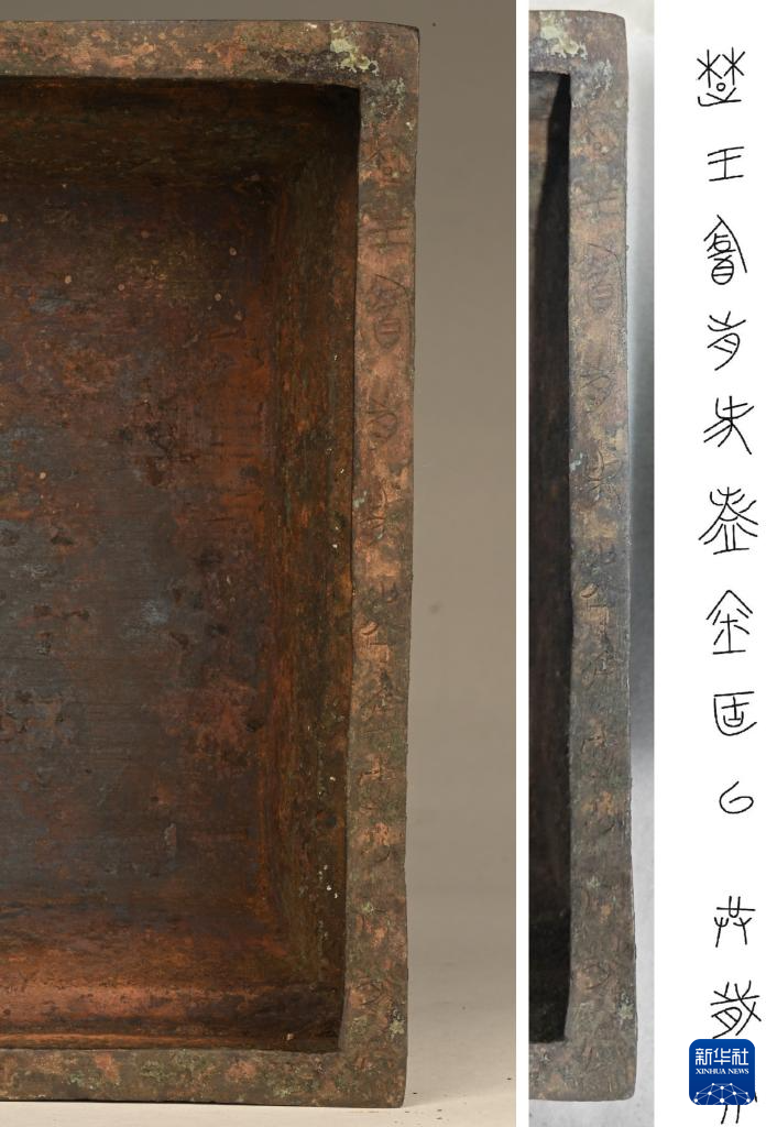武王墩墓出土的铜簠铭文(楚王酓前作铸金簠以供岁尝)(5月15日摄)。新华社发