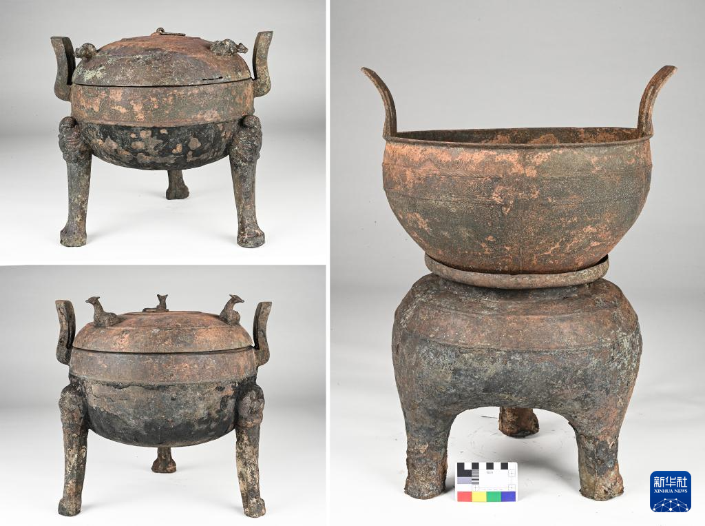 武王墩墓出土的铜鼎(左上、左下);武王墩墓出土的铜甗(右)(拼版照片,5月15日摄)。新华社发