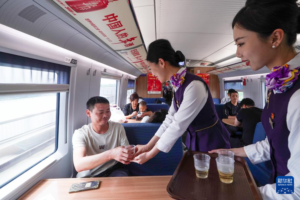 5月20日,南京客运段工作人员在G2807次高铁列车车厢内请旅客品茶。