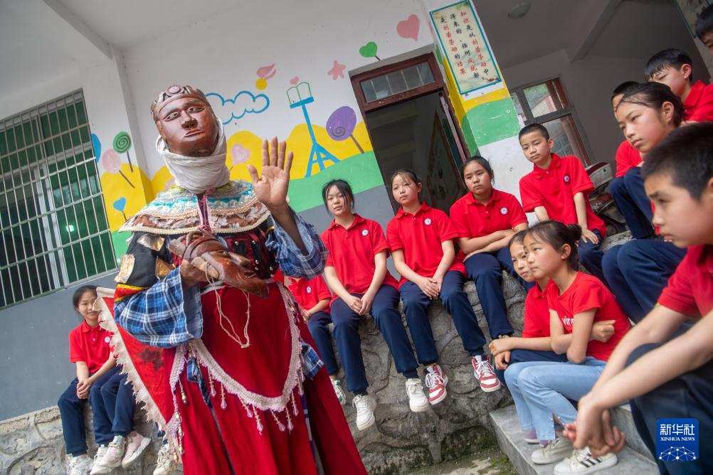 5月17日,在酉阳县丁市镇溪口小学校,陈永霞身着戏服为小学生讲授面具阳戏的魅力。