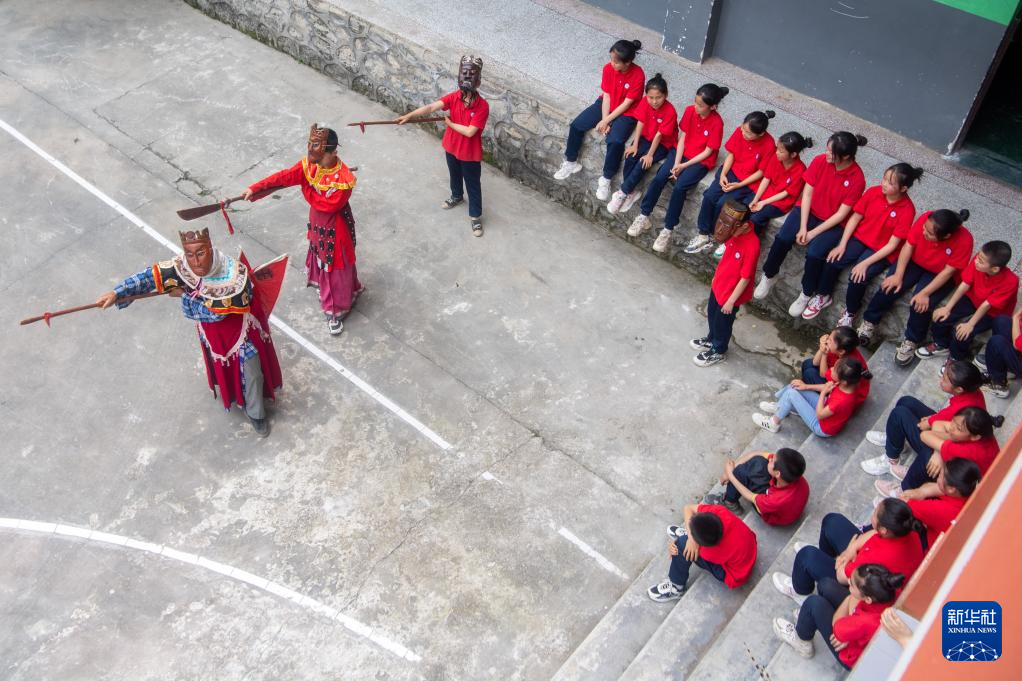 5月17日,在酉阳县丁市镇溪口小学校,陈永霞(左一)带领小学生们体验阳戏的剧目片段。