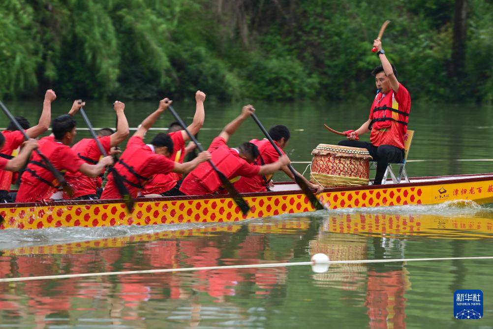 5月29日,在酉阳县龙潭镇,龙舟队在水面角逐。