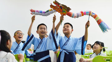 6月10日,两名学生在山东省青岛市市北区杭州路小学开展的端午文化活动上表演舞龙。
