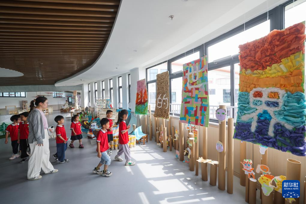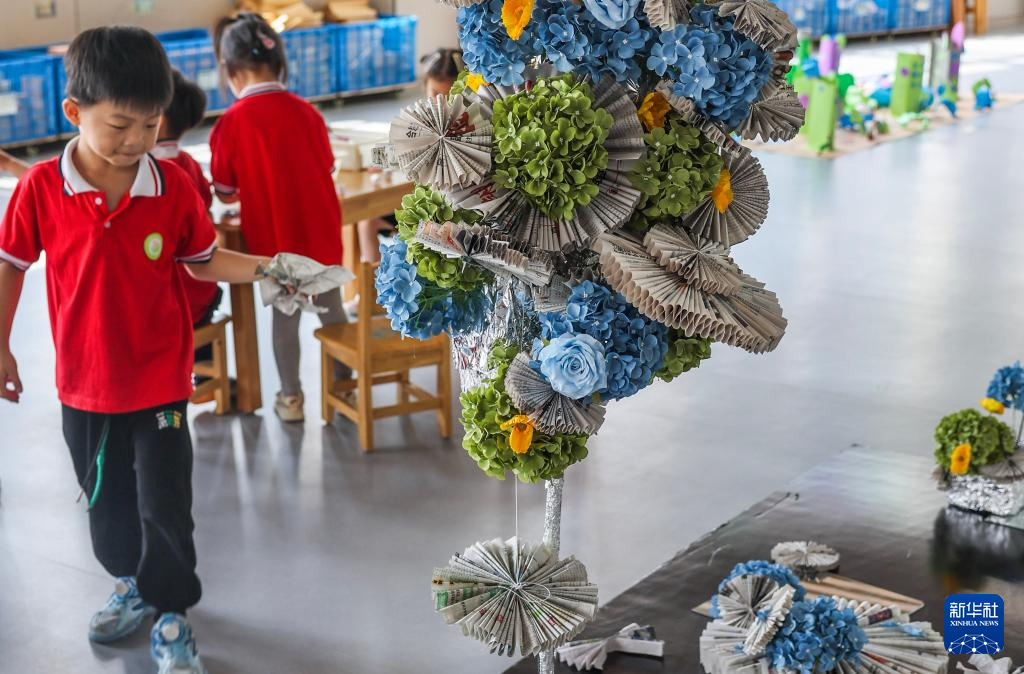 这是老师和孩子们用废旧报纸及包装纸制作的创意纸艺作品(6月13日摄)。