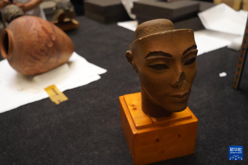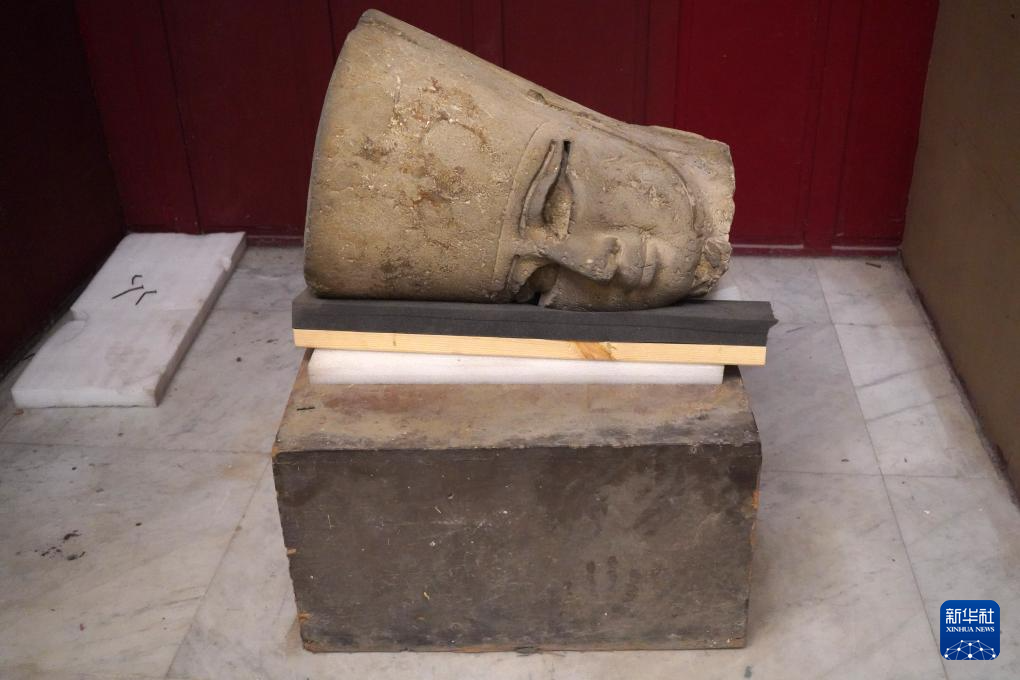 5月27日,在位于埃及首都开罗的埃及国家博物馆,工作人员对古埃及18王朝法老埃赫那吞半身像进行吊装。
