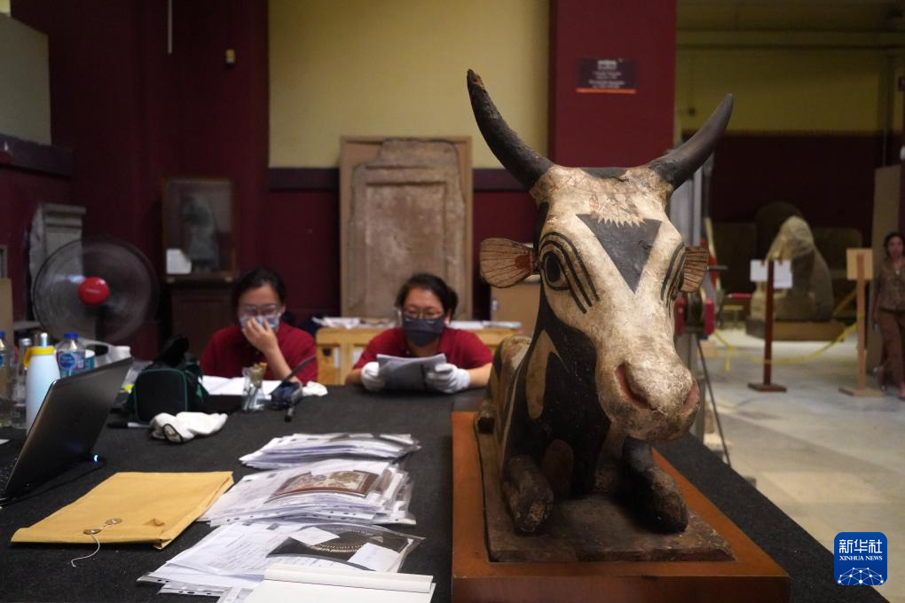 5月27日,在位于埃及首都开罗的埃及国家博物馆,工作人员对一件斯芬克斯小雕像进行打包。