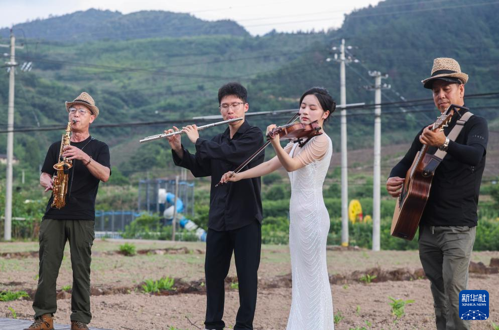 6月15日,三都镇镇头村的村民乐队乐手和杭州师范大学音乐学院的学生(右二、右三)在田间为村民即兴演出。